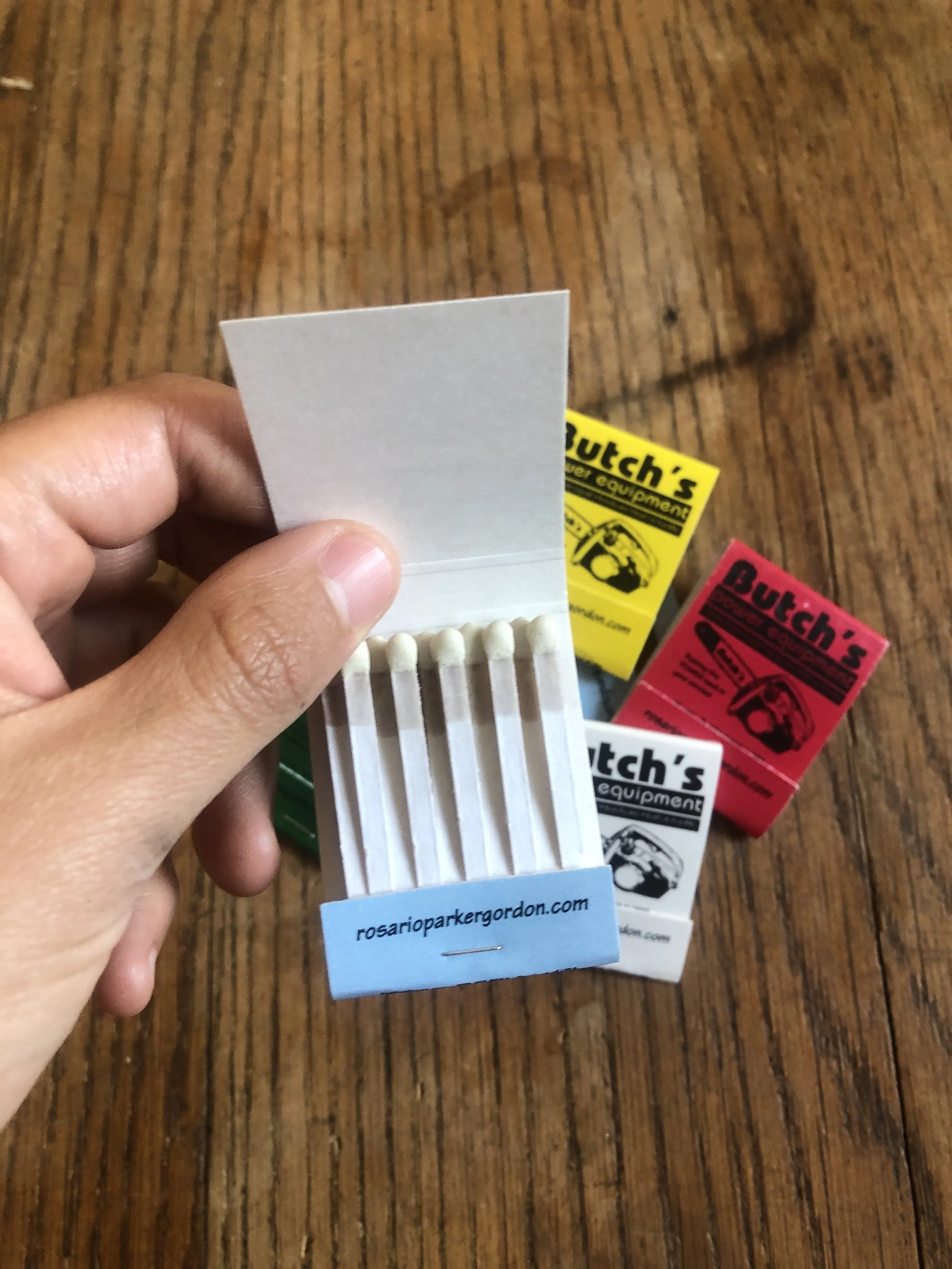 Butch’s Matchbooks are meant to be given away for free; in this exchange they create an intimate connection with viewers. The matchbooks live in your pocket, they share a cigarette with you (or between you and a lover). I am told that often their new owners will keep their matchbooks in a special designated place, with other art-adjacent objects or simply somewhere where they will be within easy reach to light a candle.